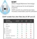 It comes with the Silver Charged Membrane Technology (SCMT). This provides double protection, and keeps the water safe and clean, by preventing any potential secondary microbial contamination post the RO purification.
