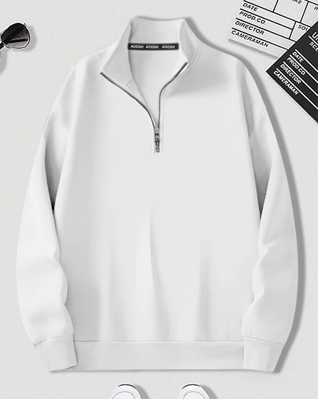 Aoosh Solid White Full Sleeve Mandarin Collar Sweatshirt For Men
