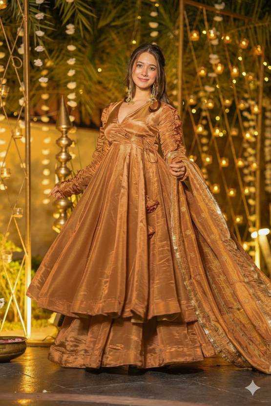 Embroidered Silk Blend Stitched Anarkali Gown (Brown)