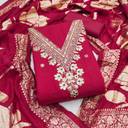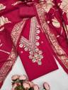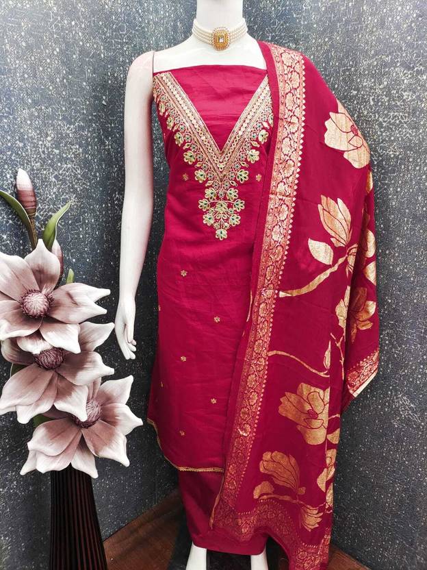 Unstitched dress material set for women including top, bottom, and optional dupatta (as applicable), made from specified fabrics with exact fabric lengths mentioned; suitable for casual or festive wear, hand wash care, net quantity 1 set, country of origin India, model/style code provided, color as shown, and note that stitching is not included.