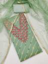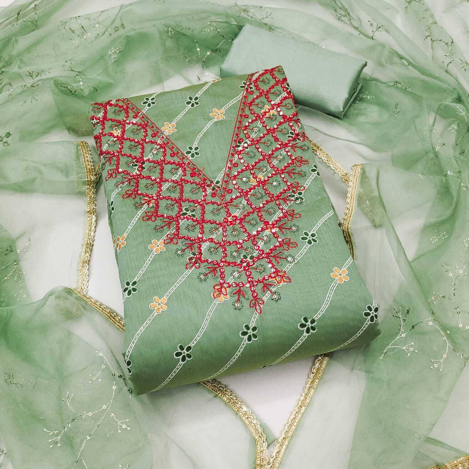 Unstitched dress material set for women including top, bottom, and optional dupatta (as applicable), made from specified fabrics with exact fabric lengths mentioned; suitable for casual or festive wear, hand wash care, net quantity 1 set, country of origin India, model/style code provided, color as shown, and note that stitching is not included.