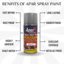 Apar paints are excellent for general uses, its coat durable against heat and prevents the metal surface from rust. It’s Fast-drying, long lasting, vibrant, High Gloss, Excellent Coverage, Corrosion Resistance, highly adhesive on wood, plastics and metal surfaces, With shades and types of colors invented specifically to coat perfectly and refinishing.