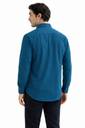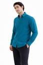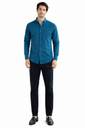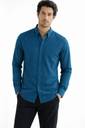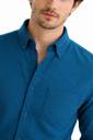 This is a men's long-sleeved button-down shirt in a deep teal/blue-green color. It features a button-down collar and a single patch pocket on the left chest. The fabric appears to be a textured material, possibly corduroy or brushed cotton, giving it a soft, casual feel. The shirt has a curved hem and buttoned cuffs. It is styled with dark trousers and loafers, suggesting a versatile casual look. Compatible with: Jeans, Chinos, Casual Trousers, Shorts.