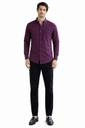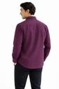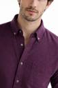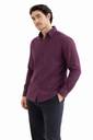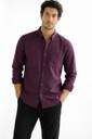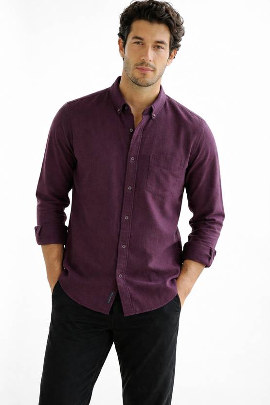 This is a men's long-sleeved, collared button-down shirt in a solid purple color. The fabric has a visible texture, suggesting a comfortable material like flannel. It features a button-down collar, a full button placket, and a single patch pocket on the left chest. The buttons are light-colored, providing a subtle contrast. The shirt has a straight hem and appears to have a regular fit. It is styled with black trousers.