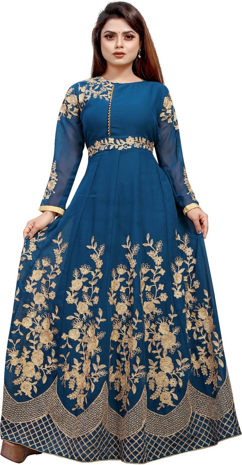 Embroidered Net Semi Stitched Flared/A-line Gown (Blue)