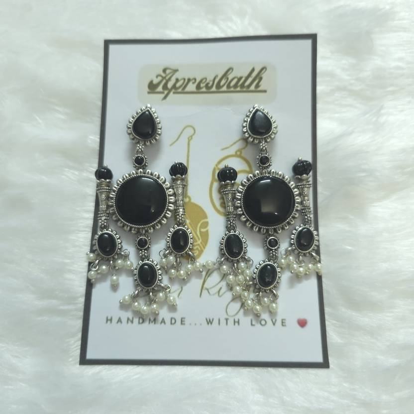 Apresbath Apresbath Black Stone Chandbali Earrings with Pearls Oxidized Silver Boho Brass Drops & Danglers