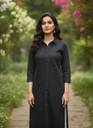 APRO Women Solid Black Denim Long Kurti with Shirt Collar & 3/4 Sleeves