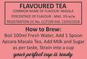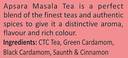 Apsara Masala Tea is a perfect blend of the finest teas and authentic spices to give it a distinctive aroma, flavor and rich colour. Ingredients : CTC Tea, Green Cardamom, Ginger ( Saunth ), Black Cardamom, Cinnamon.