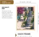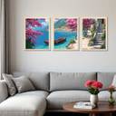 TRIPTYCH DESIGN: Beautiful three-panel Mediterranean coastal scene featuring cherry blossoms, boats, and stone steps, creating a stunning visual narrative
