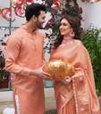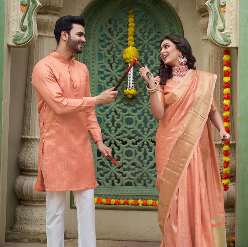 Introducing our latest collection of designer women saree and Men's kurta pyjama sets - a fusion of traditional elegance and contemporary style. Crafted to reflect the essence of togetherness, these exquisite ensembles celebrate love and grace. Embrace a timeless look that effortlessly merges two souls into one beautiful harmony. Whether you're attending a wedding, a festive celebration, or simply going out for dinner with friends, our couple wear will make you look and feel your best. Our men's collection come in a range of sizes, from M to XXL, ensuring that we have something for every body type. We also offer a range of colors to choose from, so you can find the perfect match for your personal style. We Give you Best Customer Service Till Your Product Delivered to You. Thank You.