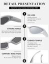 The wrap around sunglasses are made of high-quality skin-friendly material, light weight, the flexible wrapping frame can perfectly fit the contour of the face, you can wear it for long time without fatigue, also can save you from the embarrassing wear marks when you take them off.