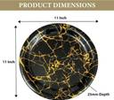 The sleek black finish adds a contemporary touch to any table setting, while the subtle gold rim enhances its sophistication, making it ideal for both casual dining and formal occasions. With a generous 11-inch diameter, these plates are perfect for serving main courses, sharing platters, or buffet-style meals.