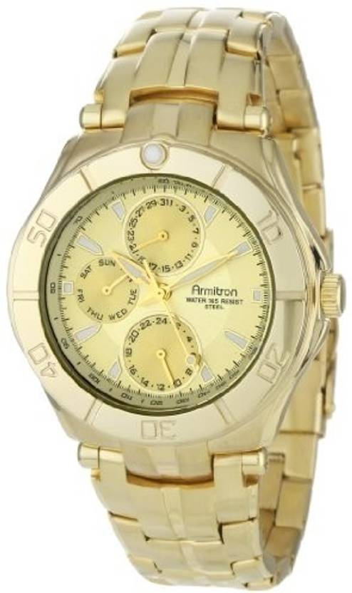 The classic Armitron mens gold-tone sub-dial watch features a stylish stainless steel case and strap along with day, date and 24-hour dials. This elegant goldtone dress watch from Armitron has the richly detailed look of a much more expensive timepiece. Crafted with a goldtone stainless steel case and bracelet it showcases a champagne dial with three luminous goldtone hands luminous markers and an outer scale with 15 second indicators. Three round subdials display the day, day of the week and a 24-hour time scale. Framing the dial is a polished goldtone bezel with etched minute markings and a luminous dot at the twelve mark. The perfect way to polish off your business or dress wardrobe this Armitron watch offers reliable quartz movement and is rated water resistant to 50 meters.