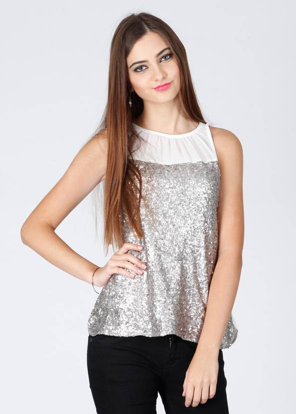 Shine bright as you make heads turn in this attractive sequin adorned top from Arrow. With subtle gather detail and button placket at the back, this party top is crafted from polyester. Style it with a pair of black denims and towering stilettos.