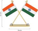 This image shows a pair of miniature Indian national flags mounted on golden poles with a black base, commonly used as a "car dashboard flag" in India.
