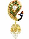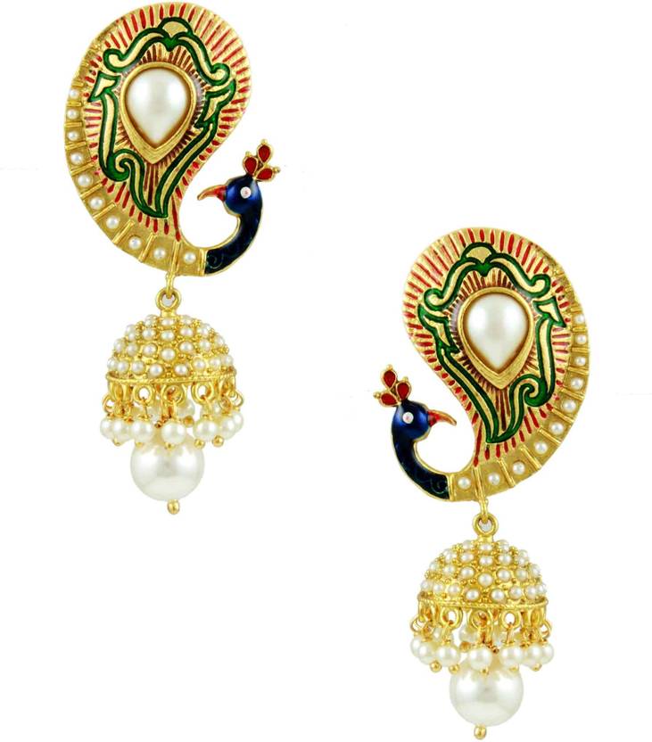 Rajwadi Peacock Jhumki in Pearl with Enamel Work Theme: Rajwadi Polish: Golden Color: Pearl