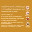 Key Features | - Desi ghee is a pure and natural form of clarified butter made from cow or buffalo milk, often using traditional methods like the Bilona process for superior quality. It is rich in essential nutrients, including vitamins A, D, E, and K, and contains healthy fats that provide numerous health benefits. With a high smoke point, desi ghee is ideal for cooking, frying, and deep-frying without degrading, making it a staple in Indian cuisine. It has a golden color and grainy texture, which are signs of authenticity, and its nutty flavor enhances the taste of various dishes. In Ayurveda, desi ghee is valued for its digestive and immunity-boosting properties, and it is also used for skin and hair health. Additionally, it has a long shelf life, requiring no refrigeration for months. For those seeking a wholesome and flavorful cooking ingredient, desi ghee remains a top choice due to its traditional appeal and health advantages.