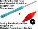 PACKAGE CONTENTS: 1 Aluminum with Plastic Handle Crochet Hook Needles, Length: 14cm, Size: 4mm + Plastic Tatting Shuttle with Bobbin, L8cmXB1.5cmXH0.5cm.
