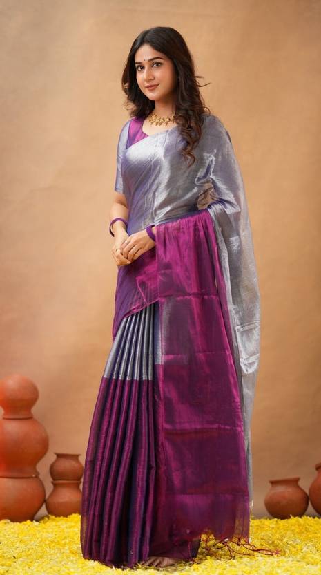 This elegant blue tissue saree from Arup is designed to offer a graceful yet effortless look for daily wear. Crafted from premium-quality tissue fabric, it combines lightweight comfort with a refined finish, making it ideal for both casual outings and semi-formal gatherings. The subtle sheen of the fabric adds a touch of sophistication, while the solid/plain pattern ensures versatile styling with a range of blouses and accessories.