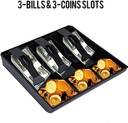 • Durable Construction : This cash register insert tray is made of quality ABS plastic which is sturdy, lightweight and durable., Multiple Dividers : Designed into 3 Bill Compartments and 3 Coin Compartments for easy organization of cash, coins, or other personal items. Cash of various values can be well classified., Easy to Use : 3 spring-loaded clips for coins/bills/checks/. It can press bills firmly and it's easy to fold it up and convenient to use., Shaped Design : design on the edge of the coin compartment makes you get coin out easily., Suggested Occasion : Suitable for home and commercial use, such as cabinets, department store, supermarket, drugstore etc. For indoor use only.