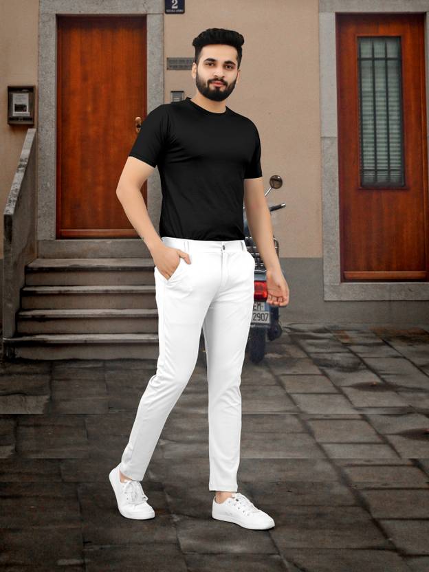Dwarkesh Impex Men Slim Fit White Cotton Blend Trousers