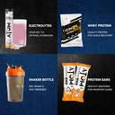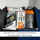 features instant electrolytes, three 24 Gold Whey Protein sachets, two protein bars, and a shaker
