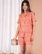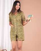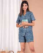 This relaxed short cotton night suit for women has shirt style pattern which will give you a cozy and comfortable night's sleep. For your convenience, the short has one pocket, and the top has button closer and a handy pocket, to carry your accessories.