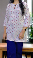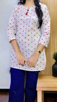 Sporting a notched neckline, this kurti provides a contemporary edge while keeping comfort in mind. The three-quarter sleeves balance coverage with breathability, while the short length adds a modern flair. The classic straight cut allows easy movement, making it suitable for all-day wear. These thoughtful details create a flattering silhouette for various body types.