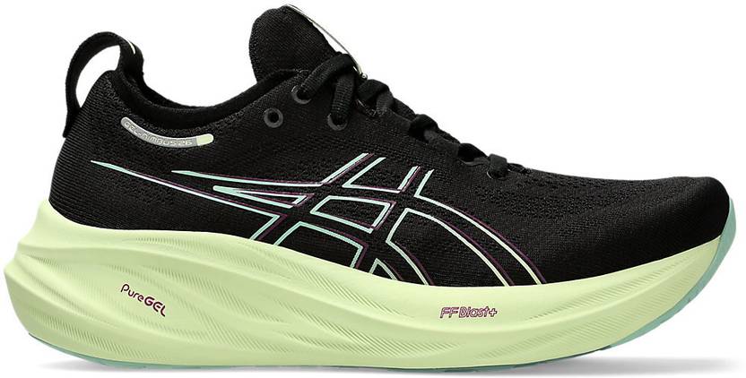 The GEL- NUMBUS 26 is the most comfortable shoe that creates a plush underfoot to help you feel like you're running on clouds, An updated knit collar and tongue construction are complemented with a revamped midfoot fit to create a more supportive fit, Outsole is strategically designed for advanced durability and grip, FF BLAST ECO PLUS cushioning helps create cloud-like cushioning properties and a greater percentage of recycled materials to support more sustainable manufacturing