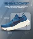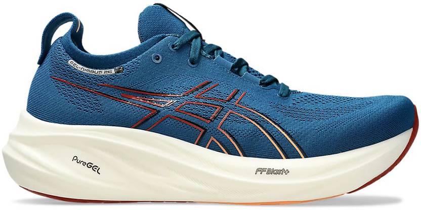 The GEL- NIMBUS 26 is the most comfortable shoe that creates a plush underfoot to help you feel like you're running on clouds, An updated knit collar and tongue construction are complemented with a revamped midfoot fit to create a more supportive fit, Outsole is strategically designed for advanced durability and grip, FF BLAST™ ECO PLUS cushioning helps create cloud-like cushioning properties and a greater percentage of recycled materials to support more sustainable manufacturing