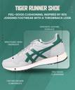The TIGER RUNNER shoe is designed for a feel-good cushioning experience and mindset. Borrowing components from the TARTHER sneaker, this shoe replicates the look of jogging footwear that was popular in the 1980s. Formed with a heritage racing flat design, this silhouette's upper blends synthetic leather paneling with mesh underlays for a throwback look.