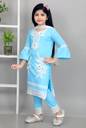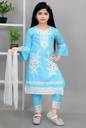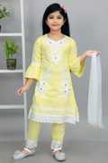 Paired with matching yellow pants adorned with white lace at the cuffs, this ensemble ensures a cohesive and stylish outfit. The pants are designed with an elastic waistband for a snug and comfortable fit, making it easy for your little one to move around freely. To complete the look, the dress includes a lightweight white dupatta that adds a traditional element, making it suitable for various occasions.