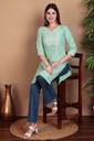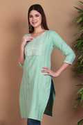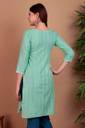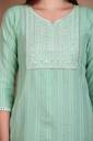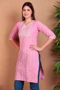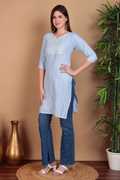 This cotton kurti is a beautiful blend of comfort and craftsmanship, featuring exquisite embroidery on the neckline and sleeves. The lightweight and breathable cotton fabric ensures a soft, relaxed fit, making it ideal for everyday wear or special occasions. The delicate embroidery on the neckline adds an elegant touch, often showcasing intricate floral or traditional patterns in vibrant or contrasting colors. The sleeves are also beautifully embroidered, complementing the design on the neckline with matching motifs or borders.