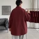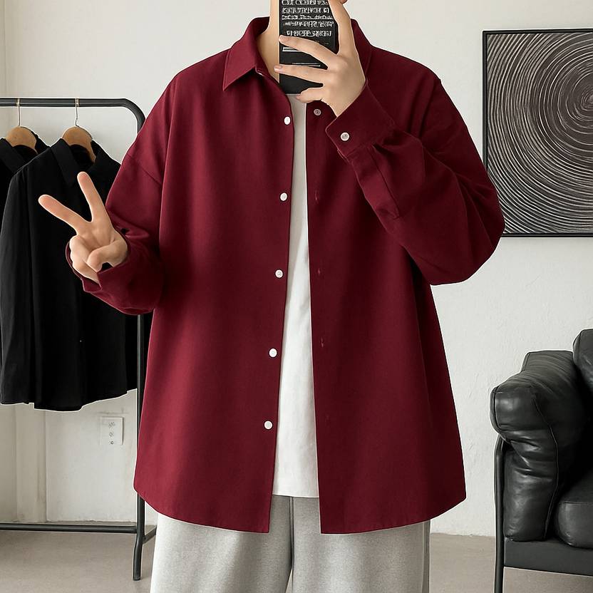 This is a maroon oversized button-up shirt for men, styled for a relaxed and modern look with a loose fit, drop shoulders, and slightly extended sleeves.