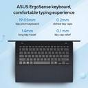 This Vivobook 14 features the ASUS ErgoSense keyboard, designed for comfort with ideal key bounce and travel. Hence, you can enjoy a pleasurable typing experience that enhances efficiency and reduces errors, making work a breeze.