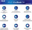The VivoBook 14 has been designed with a precision-engineered ErgoLift hinge that enables seamless dual action by holding the display at a secure angle. It also adds a 2° tilt to the keyboard to provide you with an ideal typing position every time.