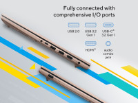 Vivobook 15 keeps you fully connected with its comprehensive I/O ports. There is one USB 3.2 Type-C Gen 1 port, two USB 3.2 Type-A Gen 1 ports, a USB 2.0 port, an HDMI output, and an audio combo jack — so it’s easy to connect all your existing peripherals, displays ,and projectors.