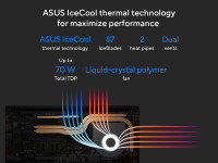 To keep your laptop cool in all situations, the ASUS IceCool thermal technology in Vivobook 16X uses upgraded 8 mm and 6 mm heat pipes, and an IceBlade fan that efficiently accelerates heat transfer. The 89-blade fan and impeller are made of a liquid-crystal polymer that means they’re lighter and thinner than ordinary fans. The end result is that the Intel Core CPU and NVIDIA GPU can run comfortably at up to a blistering 55 W combined TDP4 in Performance mode — with no throttling!