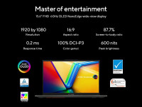 The 16:9 FHD 60 Hz OLED NanoEdge narrow bezel display on the Vivobook S 15 OLED gives you an incredible viewing experience. The broad 86% screen-to-body ratio, 100% DCI-P3 colour gamut, and fine details are all provided by this 600-nit brightness, wide-viewing screen. In order to ensure the optimum colour accuracy and the dark blacks in every image, it is also PANTONE Validated and VESA DisplayHDRTM True Black 600 certified. Additionally, it has low blue light eye protection certification from SGS and TUV Rheinland, which can guard your eyes during lengthy viewing.