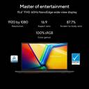 The Vivobook S 15 OLED is equipped with a 16:9 FHD NanoEdge narrow bezel display, allowing you to enjoy the ultimate viewing experience. This wide-viewing, 300-nit brightness screen delivers sharp details, a wide 86% screen-to-body ratio, and a 100% sRGB color gamut for ultra-vibrant, vivid colors. In addition, it is also certified by SGS and TUV Rheinland for low blue light eye protection, which can protect your eyes during prolonged viewing.