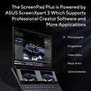 When paired with the modern ScreenPad Plus, the Zenbook Pro 14 Duo OLED, which has been created for creative genius, provides breathtaking graphics on its 36.83 cm (14.5), 2.8K, 120 Hz OLED NanoEdge touch screen. The primary touchscreen is PANTONE Validated and Dolby Vision Certified for precise colour depiction, and it has a large 16:10 aspect ratio. Due to its 100% DCI-P3 colour gamut and 120 Hz refresh rate as well as its 0.2 ms reaction time, even the most frantic action scenes appear extraordinarily fluid. TUV Rheinland certified it for decreased blue-light emissions as well.