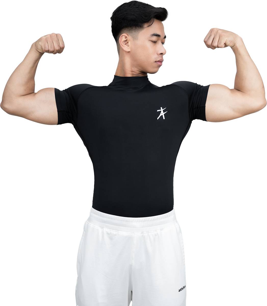The Athflex Men's Hustle High Neck Half Sleeve Compression T-Shirt is the perfect choice for your active lifestyle. Crafted with high-quality compression fabric, this shirt provides optimal support and muscle recovery during intense workouts or sports activities. The half-sleeve design offers freedom of movement, while the high neck collar ensures a snug and comfortable fit. This compression shirt wicks away moisture, keeping you cool and dry throughout your workout. Designed with a sleek, form-fitting silhouette, it enhances your physique and boosts your confidence. Whether you're hitting the gym, running, or playing your favourite sport, this versatile shirt will become your go-to choice for superior performance and comfort. Available in a crisp white colour, it's easy to pair with your favourite workout gear. Embrace the hustle with the Athflex Men's Hustle High Neck Half Sleeve Compression T-Shirt and elevate your fitness journey.