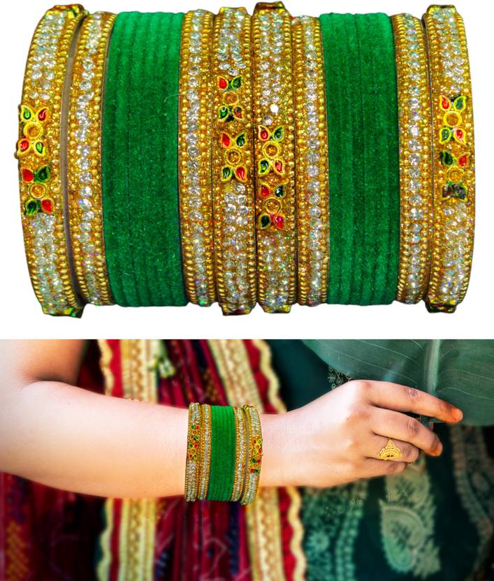 Built with a durable metal base, this set ensures long-lasting wear and reliability. Featuring soft and elegant velvet craftsmanship, the interior is designed to provide enhanced comfort throughout the day. And, thanks to the sturdy materials, the bangles maintain their form and finish over time, allowing them to stay visually appealing even with repeated use. Also, owing to the smooth surface, the bangles are easy to wear without causing discomfort, making them ideal for extended use during events.