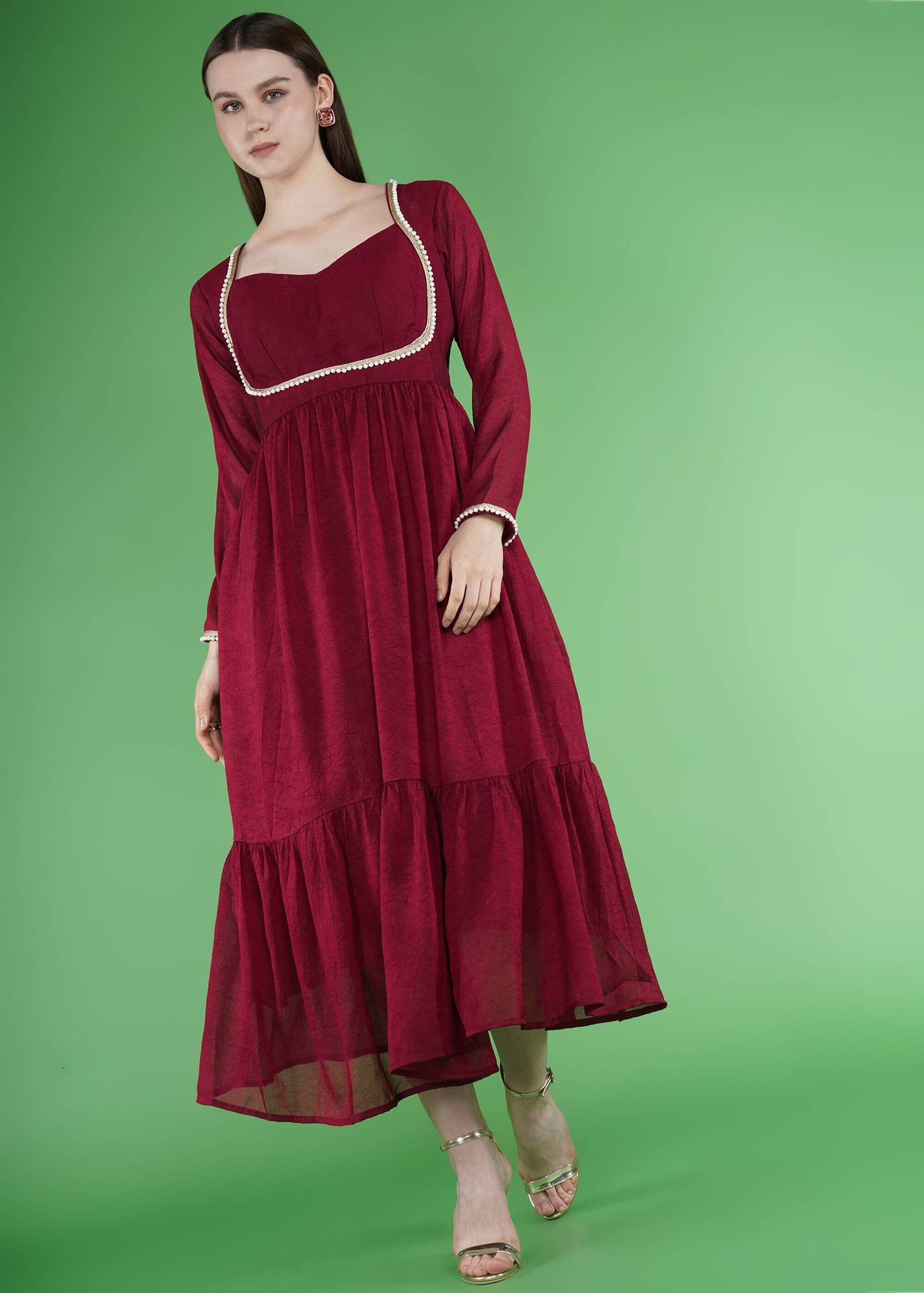 Sporting a flattering neckline, this gown brings softness to the upper design, while the long sleeves offer a balanced and modest look. The flared structure includes a gathered waistline and flowing, tiered hem, ensuring graceful movement as you walk. Together, these elements form a timeless profile that supports comfort while offering visual appeal.