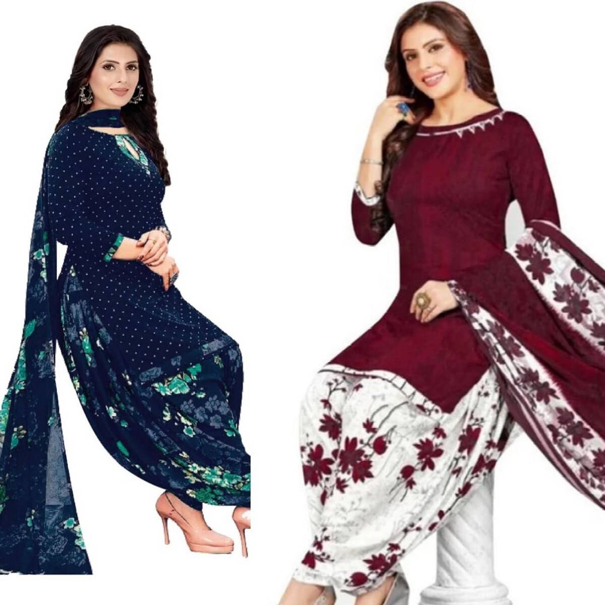 Womens Crepe Printed Unstiched Dress Material. Add style to your Daily Wear Collection with this Printed Dress material Salwar suit. 2 Unstitched Salwar, 2 Unstitched Top, 2 Dupatta.Top & Bottom Fabric : American Crepe, Dupatta Fabric : Martina You can use it for daily wear purpose it will give you immense comfort and fresh styling look.