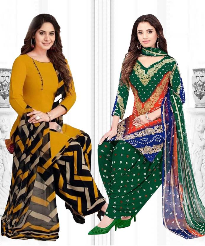 Womens Crepe Printed Unstiched Dress Material. Add style to your Daily Wear Collection with this Printed Dress material Salwar suit. 2 Unstitched Salwar, 2 Unstitched Top, 2 Dupatta.Top & Bottom Fabric : American Crepe, Dupatta Fabric : Martina You can use it for daily wear purpose it will give you immense comfort and fresh styling look.