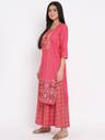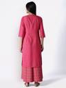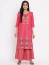 A kurta set laced with elegance to make you look graceful on all occasions. It features a rose pink glittered geometric print straight kurta having zari embroidered yoke with round neckline and three-quarter sleeves. Well-matched with calf length printed flared culottes.