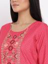 Top> Fabric Name : Polyester (100% Polyester); Wash Care : Hand Wash; Sleeve Length : 3/4 Sleeve; Sleeve Style : Regular; Pattern : Embroidered; Brand Color : Rose Pink; Ornamentation : Zari & Thread Emb; Shape : Straight; Fit : Regular Fit; Neck : Round Neck