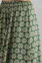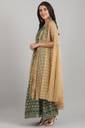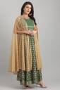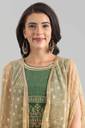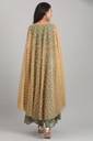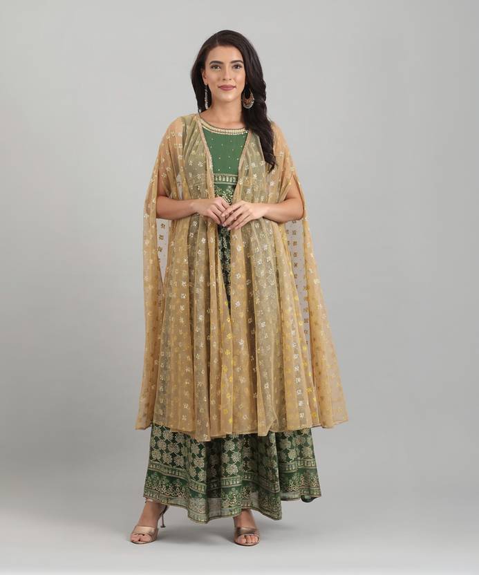 This set has a green round neck embellished top, printed skirt and shimmery gilet.