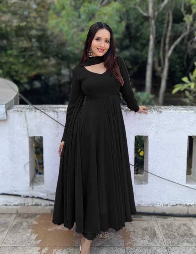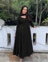 tep into timeless elegance with this stunning black Anarkali gown. Crafted from premium flowing fabric, this full-length gown offers a graceful silhouette that exudes sophistication. The solid black design is elevated with subtle gold accents along the dupatta's border, adding a touch of luxury to this classic ensemble. Perfect for festive occasions, evening parties, or wedding functions, this outfit strikes the perfect balance between modern style and traditi*Key Features:*